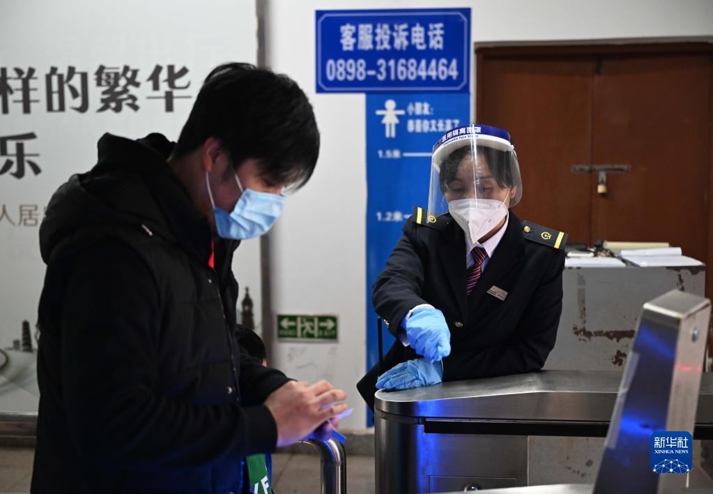 在廣東徐聞的粵海鐵路輪渡北港碼頭客運樓,肖玉鳳(右)協助旅客刷票通過閘機(1月8日攝)。