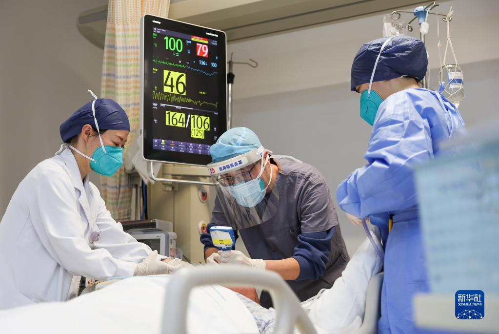 1月4日,在復(fù)旦大學(xué)附屬華山醫(yī)院虹橋院區(qū)急診搶救室,急診科醫(yī)生徐吉(左)和同事給患者氣管插管。