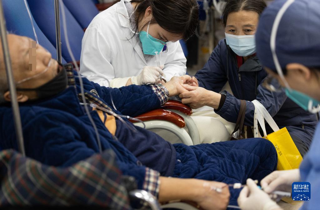 1月12日,在復旦大學附屬華山醫院虹橋院區急診輸液室,醫護人員在救治患者。