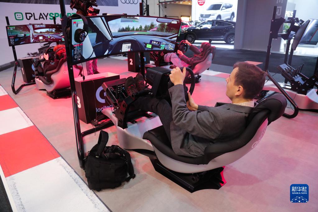 1月13日,人們?cè)诒壤麜r(shí)布魯塞爾舉辦的第100屆布魯塞爾車展媒體預(yù)展電子競(jìng)技展區(qū)參觀體驗(yàn)。