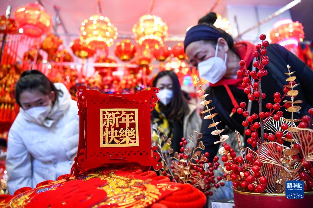春節臨近,人們紛紛開始置辦年貨迎接節日的到來,年貨市場內一派紅紅火火的喜人景象。新華社發(侯崇慧 攝)