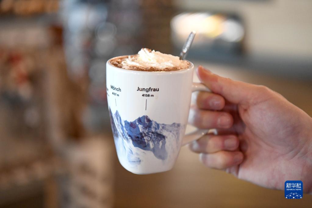 1月12日,一名游客在瑞士少女峰滑雪場的咖啡店里展示印有少女峰圖案的咖啡杯。