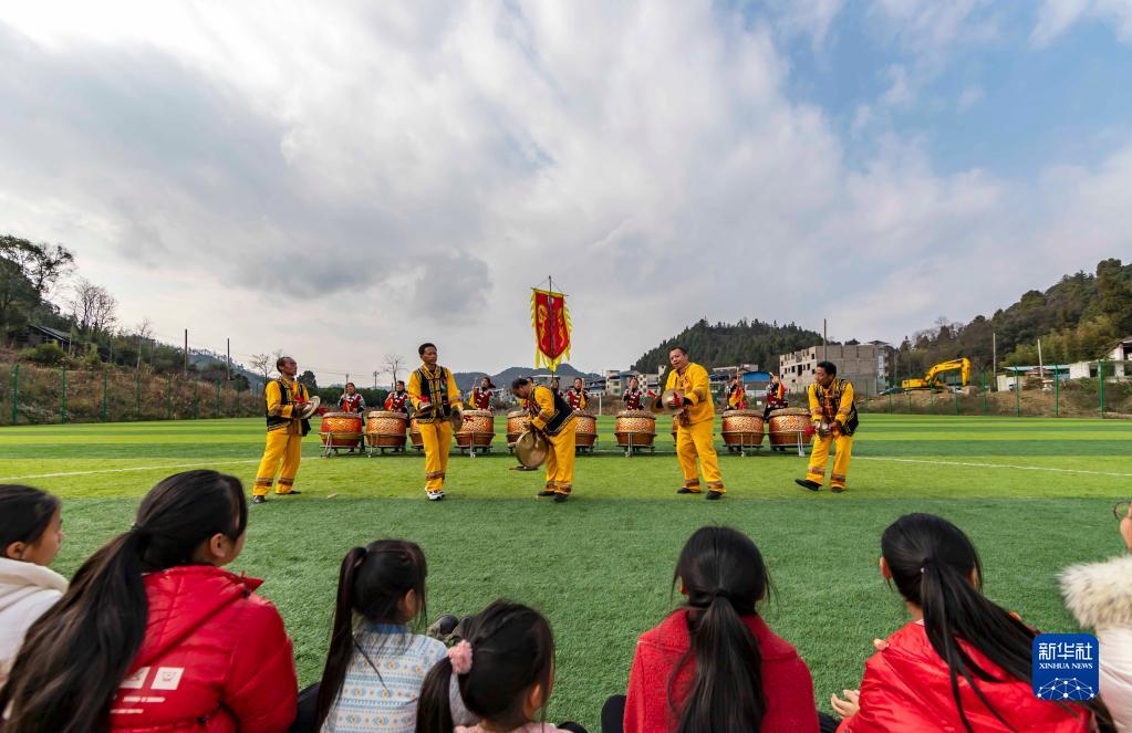 1月13日,在岑鞏縣天馬鎮天馬村,民間藝人在表演“思州戰鼓”。