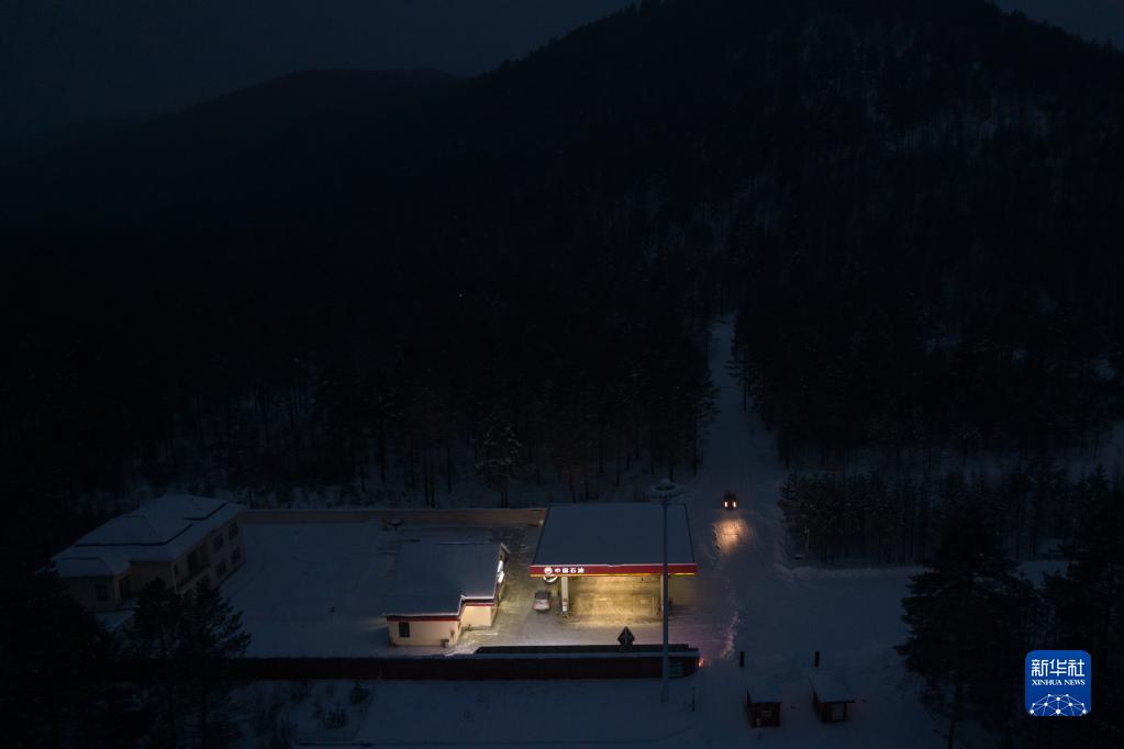 這是1月12日拍攝的夜幕下的北極村加油站(無人機照片)。