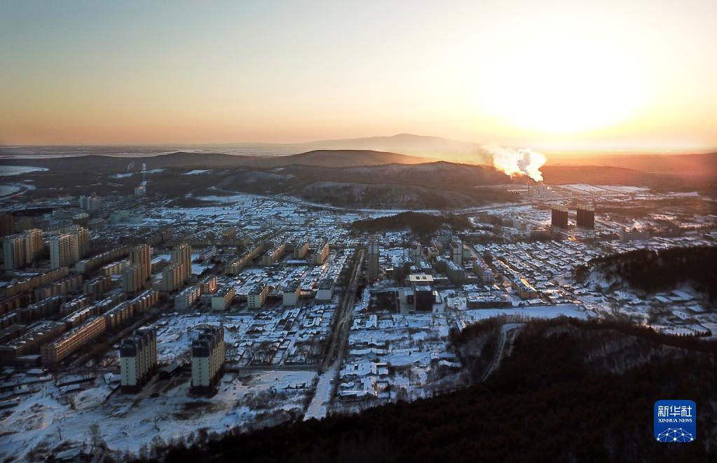 1月14日,晨光照耀著黑龍江省撫遠(yuǎn)市城區(qū)(無人機(jī)照片)。