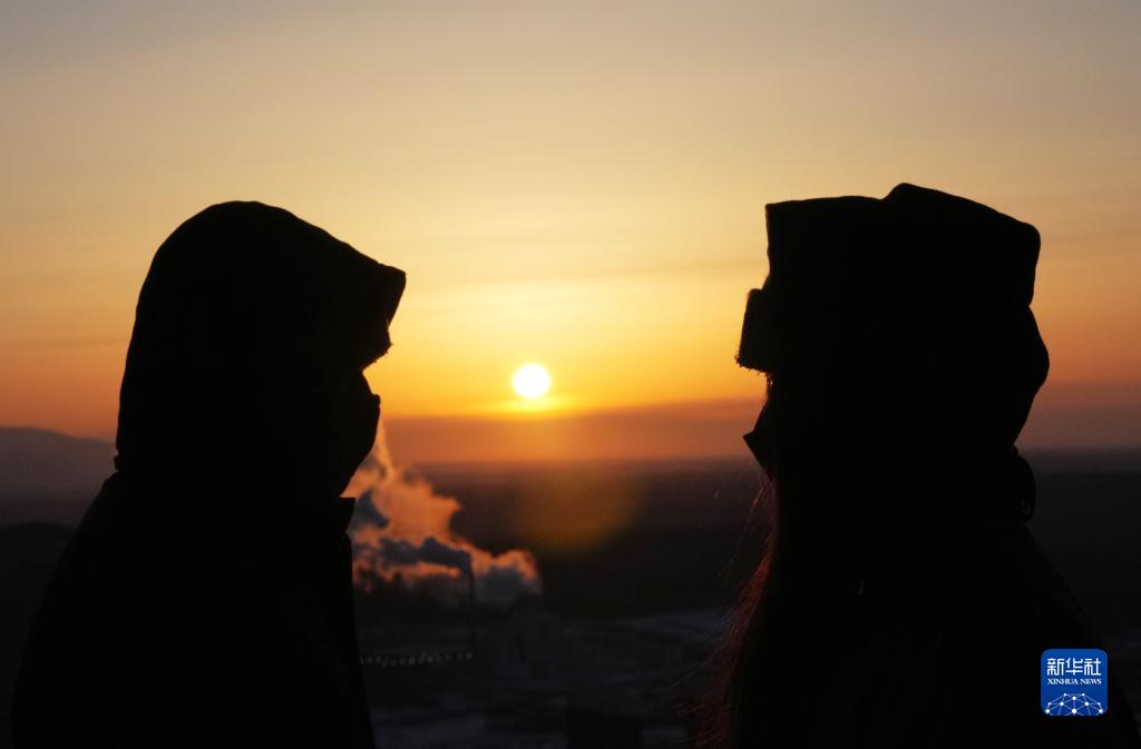1月14日,游客在黑龍江省撫遠市東極閣觀看日出。