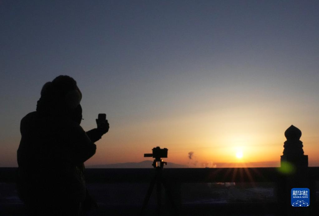 1月14日,在黑龍江省撫遠市東極閣,游客在日出時拍照。