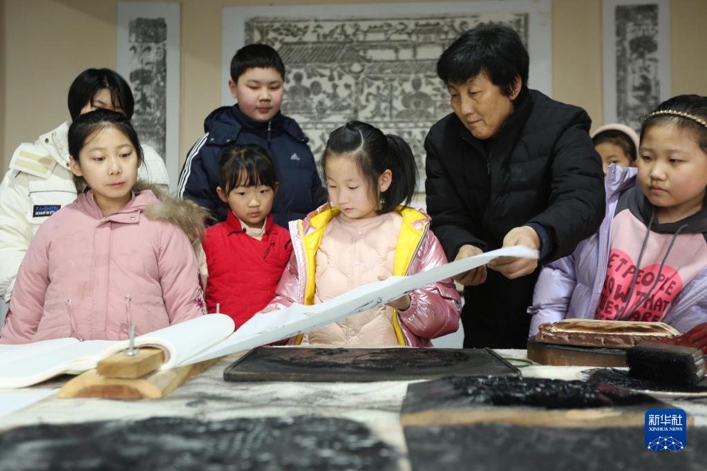 1月13日,在山東省臨沂市沂南縣博物館,木版年畫傳承人(右二)給孩子們講授木版年畫制作技藝。