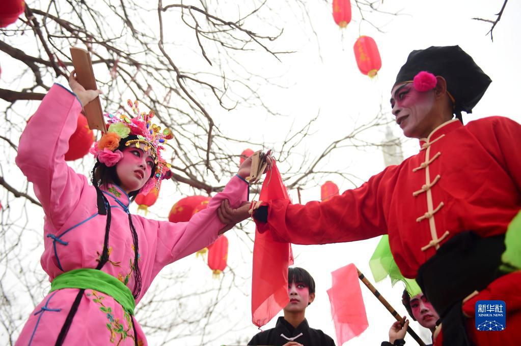 1月13日,河北省滄州市滄縣感化屯村滄州落子老藝人蔣松林(右一)向孩子們傳授滄州落子表演的基本動作。