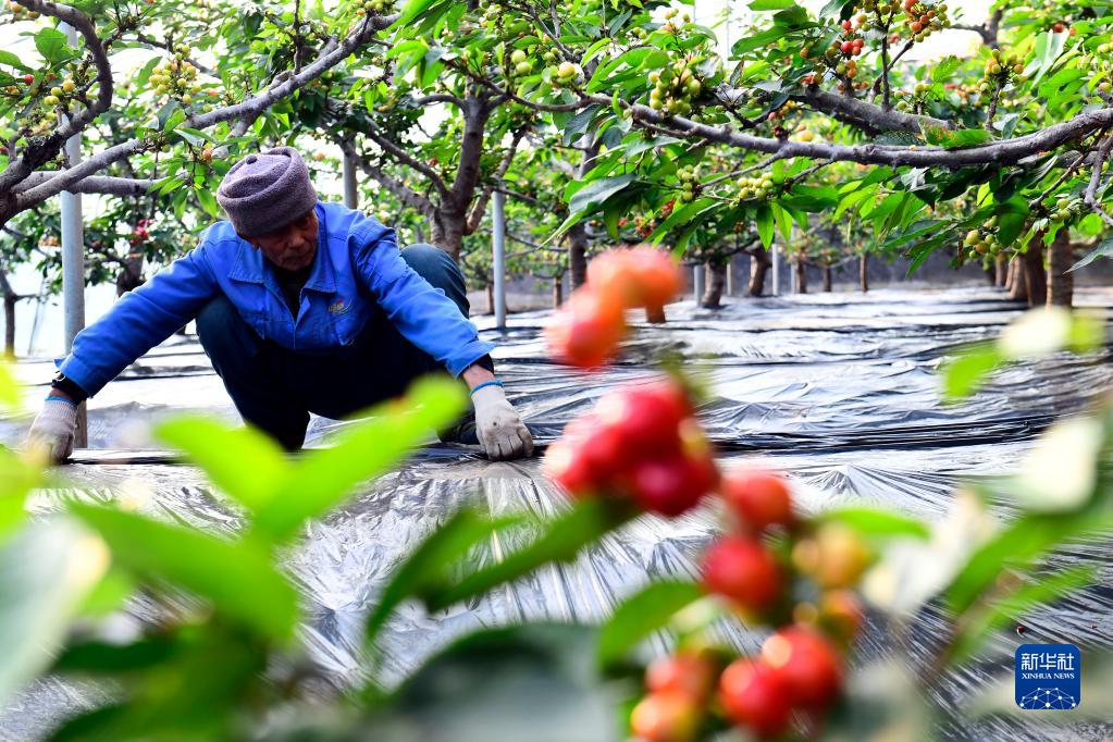 1月14日,在五蓮縣戶部鄉果樹大本營,工作人員在管護設施大棚里的櫻桃。