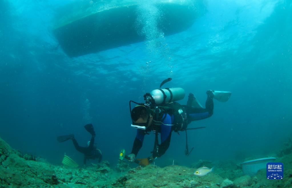 在海南省三亞市亞龍灣相關海域,潛水員在水下作業(2022年11月17日攝)。