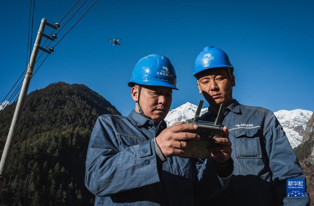1月10日,旺登(右)與同事張金程開展無人機巡線作業。