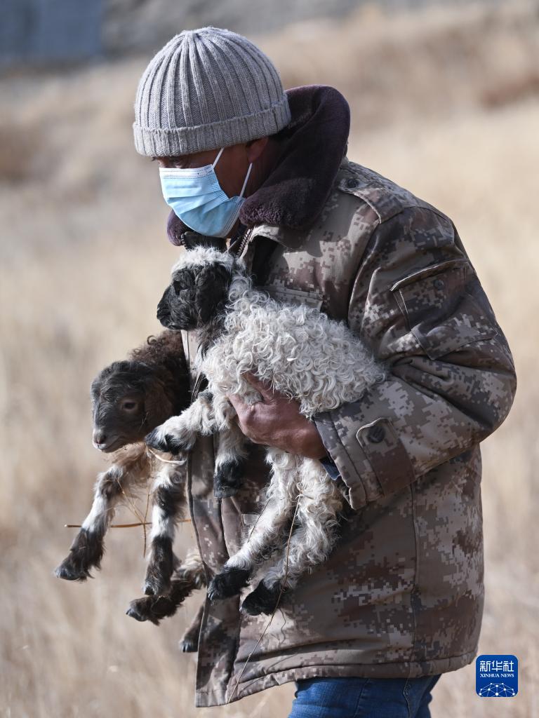 1月12日,在青海省海北藏族自治州剛察縣伊克烏蘭鄉剛察貢麻村,牧民吉科加照料兩只剛出生的羊羔。