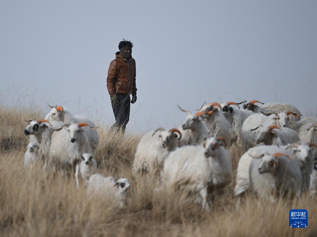 1月13日,在青海湖湖東種羊場,牧工在照料羊群。