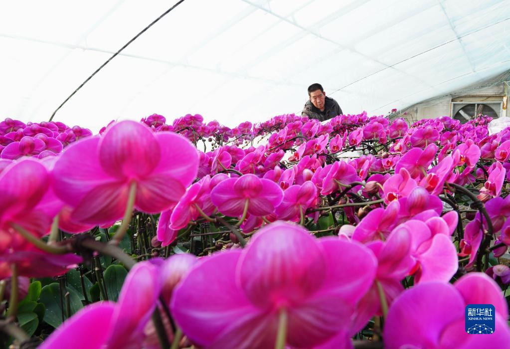 1月14日,唐山市灤南縣宋道口鎮東清水村的花農在大棚內管護蝴蝶蘭。