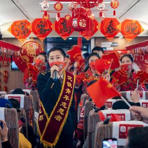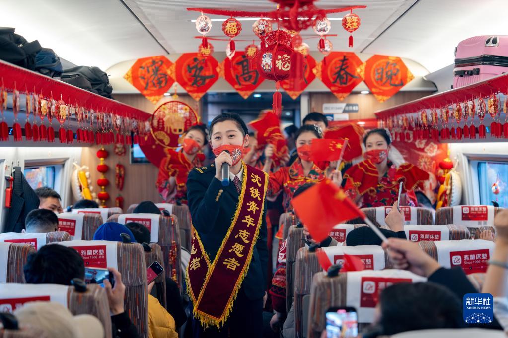1月13日,在丹東開往上海虹橋的G1230次列車上,列車乘務人員為旅客準備了一場熱鬧的高鐵聯歡會,在歡歌笑語中迎接農歷小年。