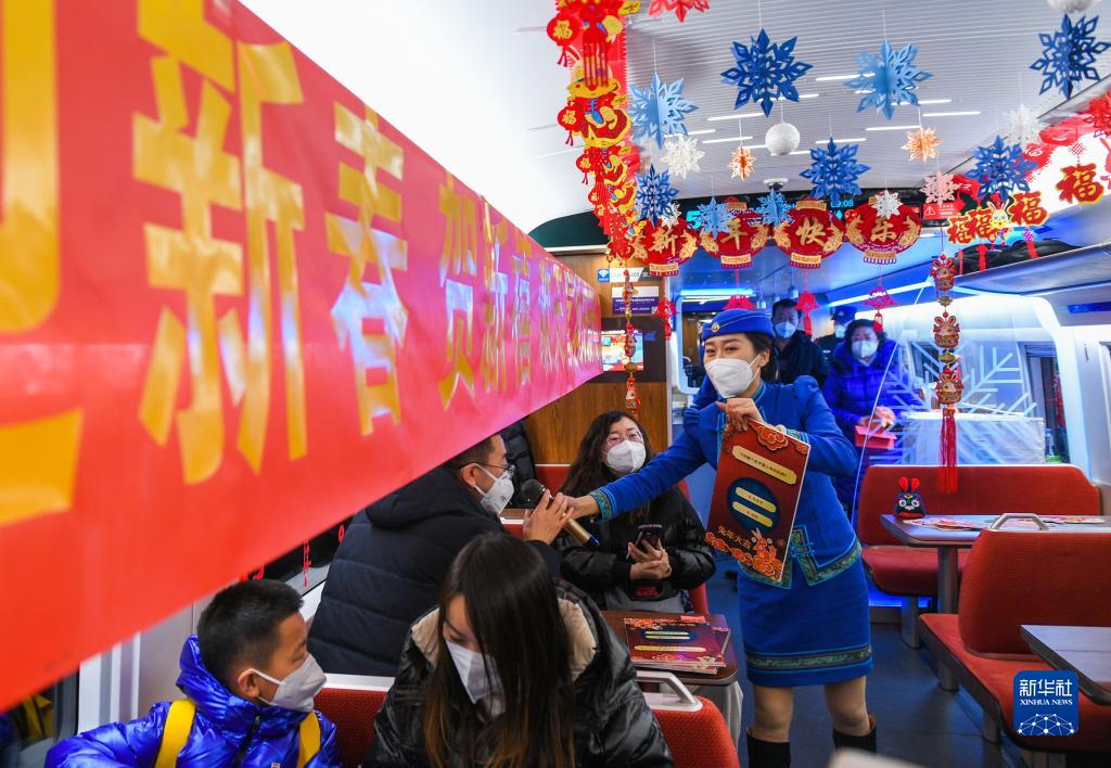 1月14日,在G2457次復(fù)興號(hào)列車上,乘務(wù)人員和旅客進(jìn)行民俗問(wèn)答游戲。