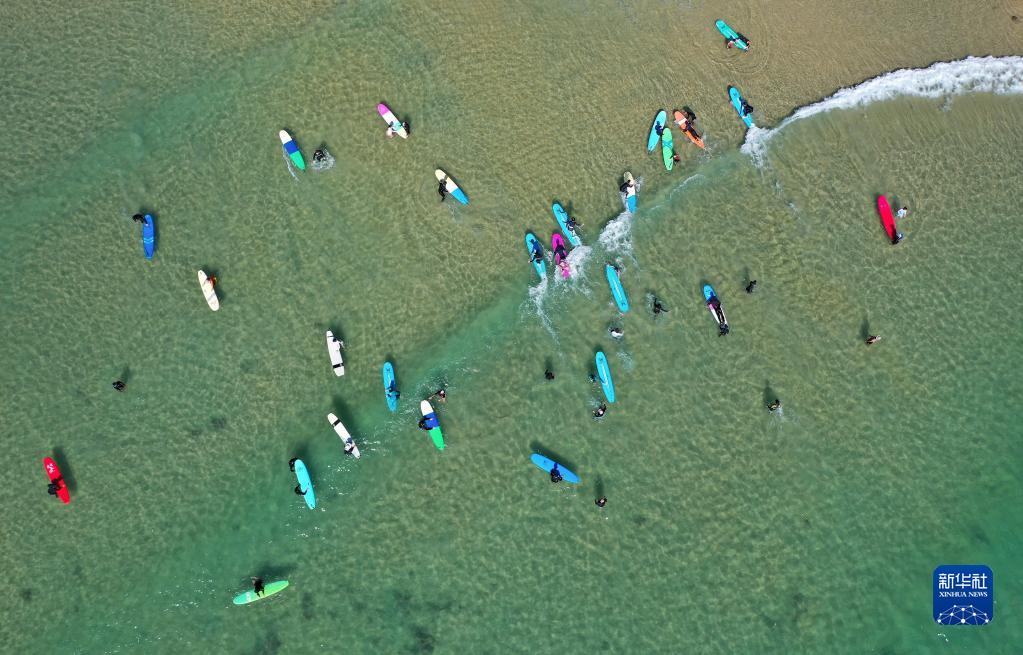 冬日的海南萬寧艷陽高照、溫暖如夏,各地游客來到這里體驗沖浪。得益于獨特的地理和氣候優勢,沖浪已成為海南萬寧旅游的一張靚麗名片。