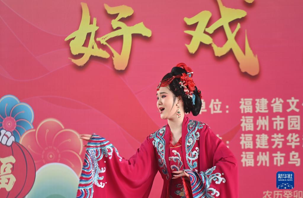 1月14日,福建芳華越劇院演員在福州市烏龍江公園表演節目。