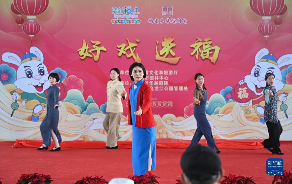 1月14日,福建芳華越劇院演員在福州市烏龍江公園表演節目。