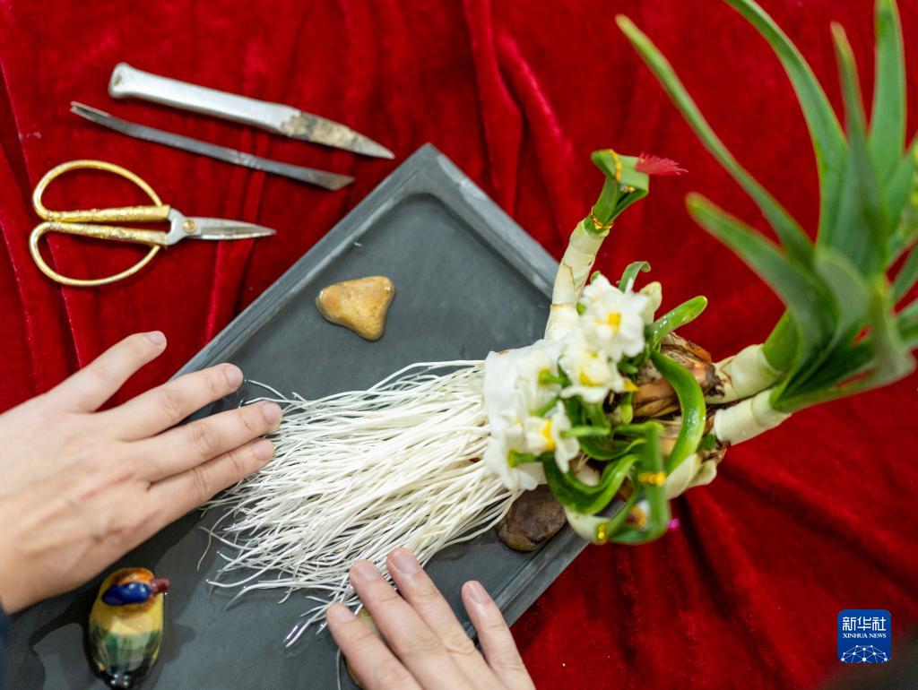 多年來,福建漳州花農探索出種球閹割、三年復種的水仙種植技術,收獲鱗莖碩大、花苞較多的花球。一顆飽滿的水仙花球要通過雕刻師開蓋、疏隙、削葉等雕刻步驟初步成形,經過一個月左右的養護,再加以創意雕琢,塑造出各式各樣的水仙花雕藝盆景,為新春佳節增添一抹詩情畫意。新華社發(張旭 攝)