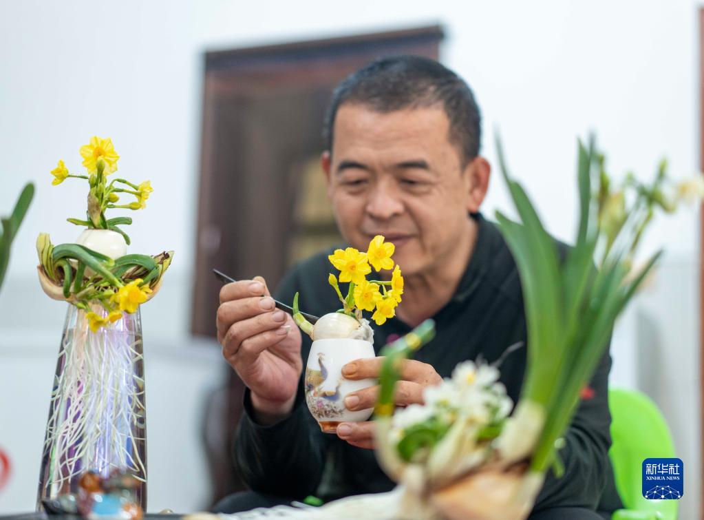1月13日,在福建省漳州高新區(qū)九湖鎮(zhèn)田中央村,水仙雕刻師陳建清對水仙雕刻作品擺盆造型。
