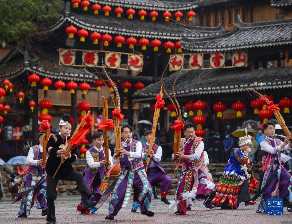 新春將至,在貴州省黔東南苗族侗族自治州雷山縣西江鎮,盛裝打扮的村民載歌載舞,熱鬧迎佳節。新華社發(龍順偉 攝)
