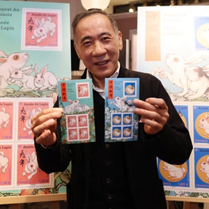 為迎接中國農歷新年,法國郵政公司14日在巴黎舉行中國兔年生肖紀念郵票發行儀式。中國兔年生肖紀念郵票共兩款,由法國華人藝術家陳江洪設計。新華社記者 高靜 攝