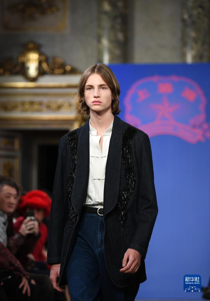 1月14日,一名模特在意大利米蘭男裝周上展示上海灘品牌時裝。