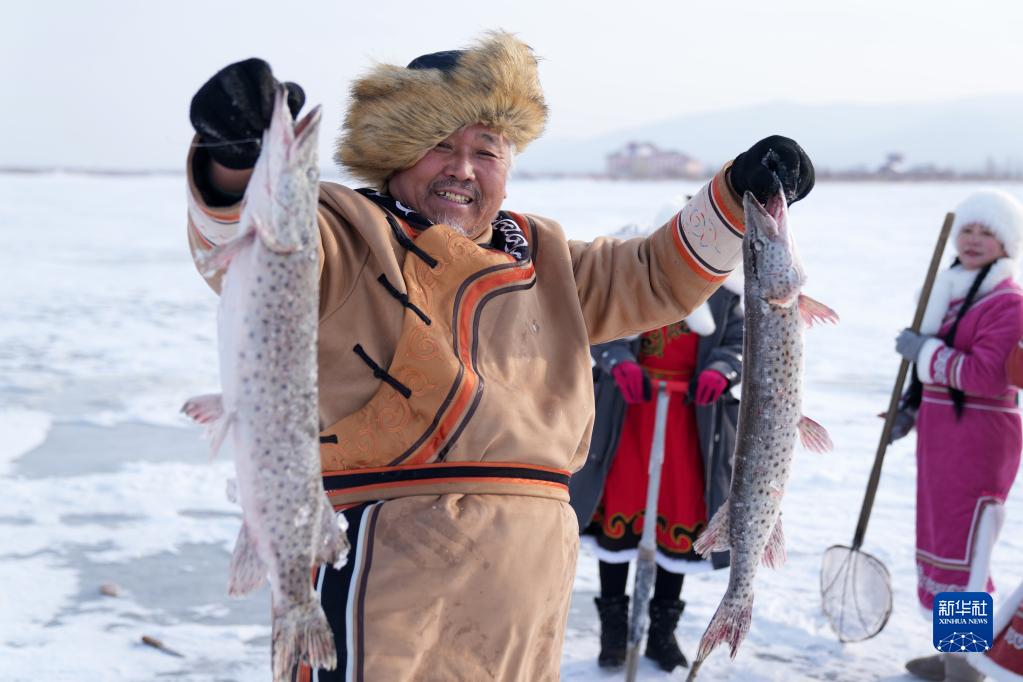 1月11日,在撫遠(yuǎn)市東湖,赫哲族群眾展示剛捕上來的魚。