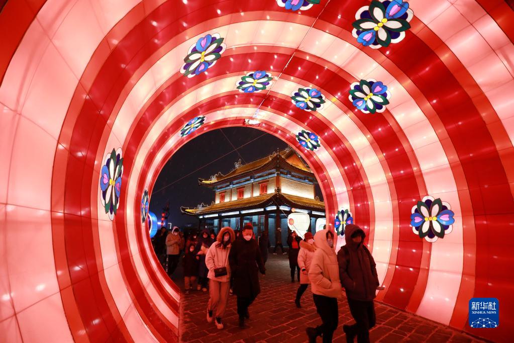 1月14日,人們在第36屆西安城墻新春燈會上參觀游玩。