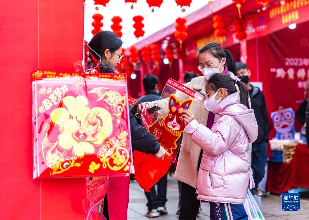 1月14日,人們在貴州省安順市西秀區一年貨市場上選購新春飾品。