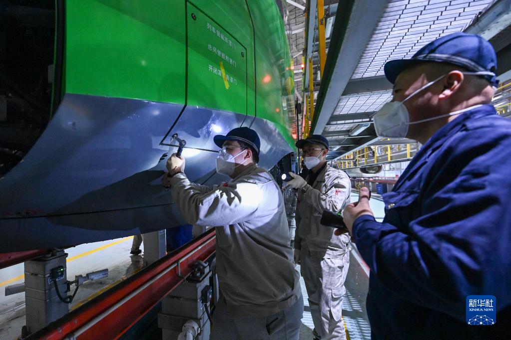 1月14日北方小年夜,烏魯木齊車輛段動車組運用所檢修庫內燈火通明,白天馳騁天山南北的動車在這里集結,一群青年機械師在連夜進行檢查、測試、維修工作,以保障動車運行安全。