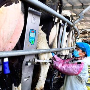 1月15日,在衛崗乳業日照鮮純生態牧業有限公司,工作人員在進行擠奶作業。