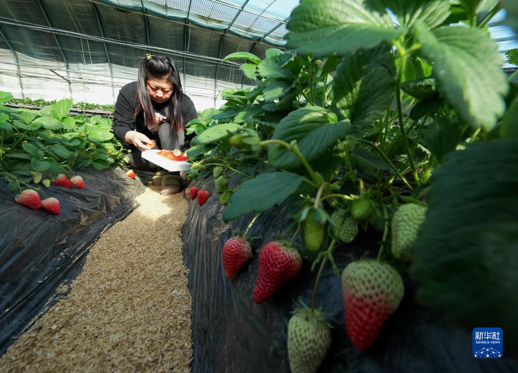 1月15日,昌黎縣昌黎鎮(zhèn)劉李莊村的農(nóng)民在大棚內采摘草莓。