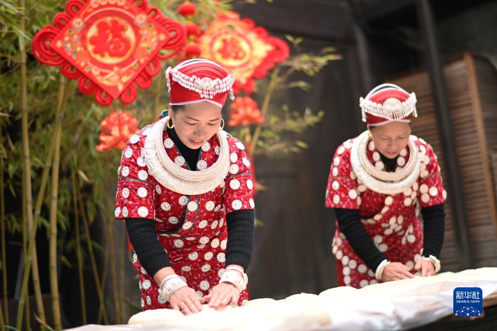 當日,在貴州省黔東南苗族侗族自治州黃平縣舊州古鎮,當地村民蒸香糯、打糍粑,喜氣洋洋地迎接農歷新年的到來。