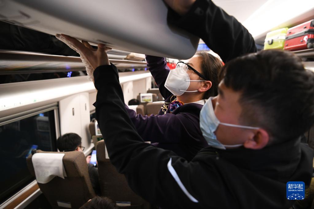 1月14日凌晨,在上海虹橋開往亳州南的G9480次高鐵列車上,中國鐵路上海局集團(tuán)有限公司合肥客運(yùn)段列車員王昊(后)幫助旅客擺放行李。