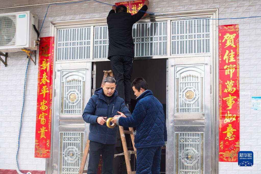 1月15日,在漢壽縣豐家鋪鎮(zhèn)筆架村,鄉(xiāng)村振興駐村工作隊(duì)成員和脫貧戶(右一)一起貼春聯(lián)。