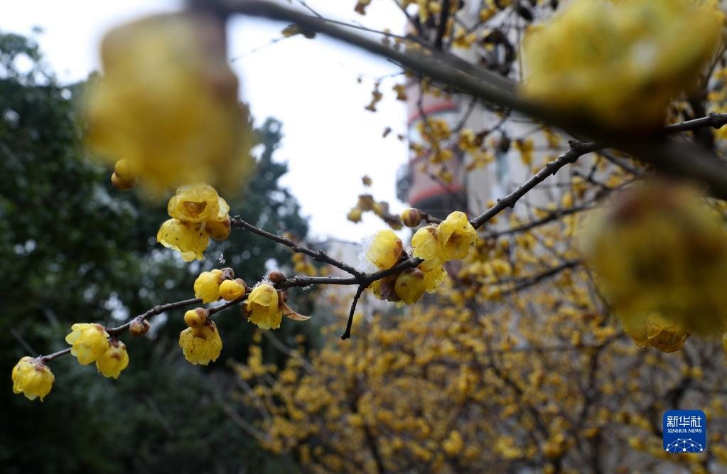 1月15日,在上海閔行區(qū)一居民小區(qū)內(nèi),雪落在臘梅枝頭。