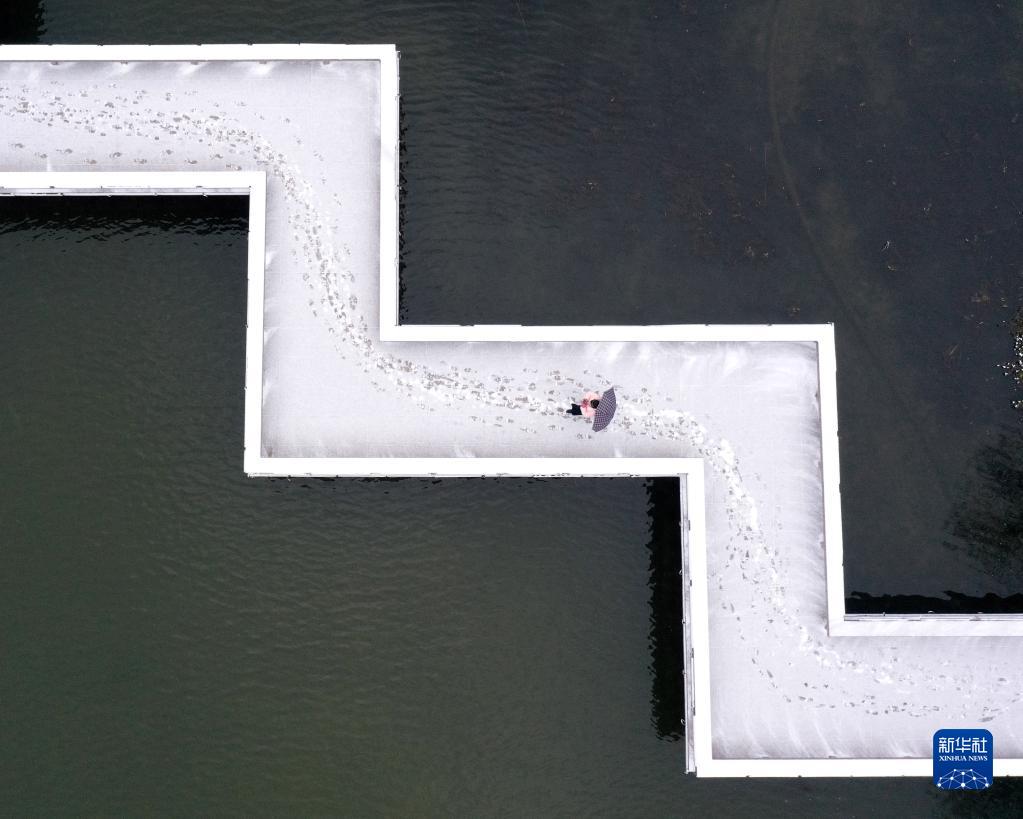 1月15日,市民行走在安徽巢湖市洗耳池公園布滿積雪的曲橋上(無人機(jī)照片)。