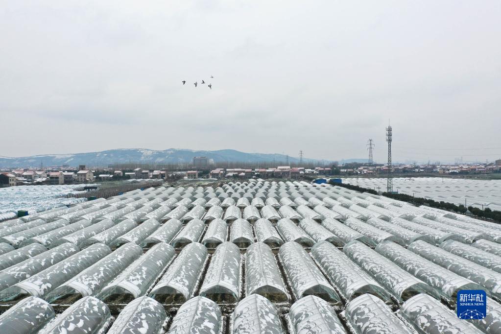 1月15日,湖南省常德市澧縣澧澹街道鄧家灘村的蔬菜大棚上覆蓋著白雪(無人機照片)。