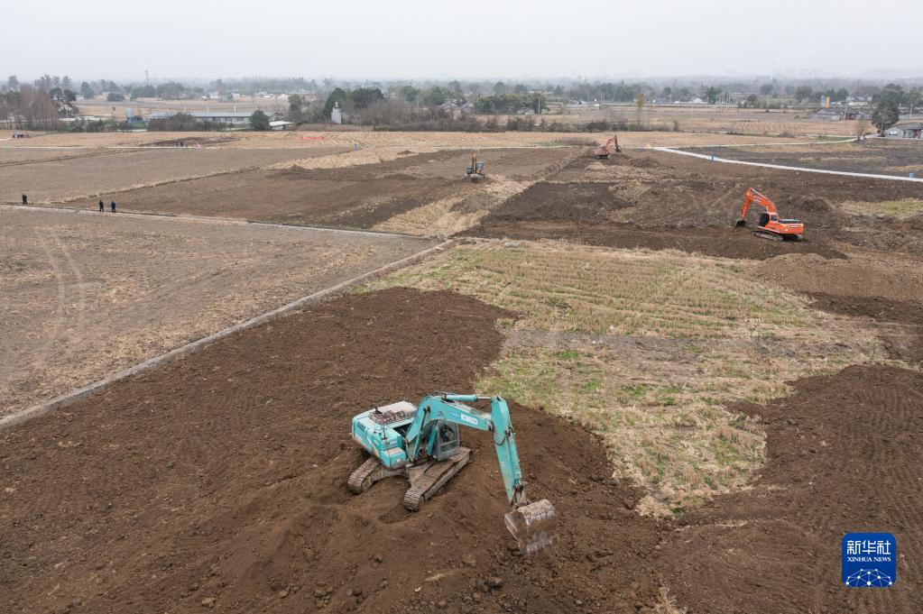 1月14日,在綿竹市孝德鎮清道社區,挖掘機在整治農田(無人機照片)。