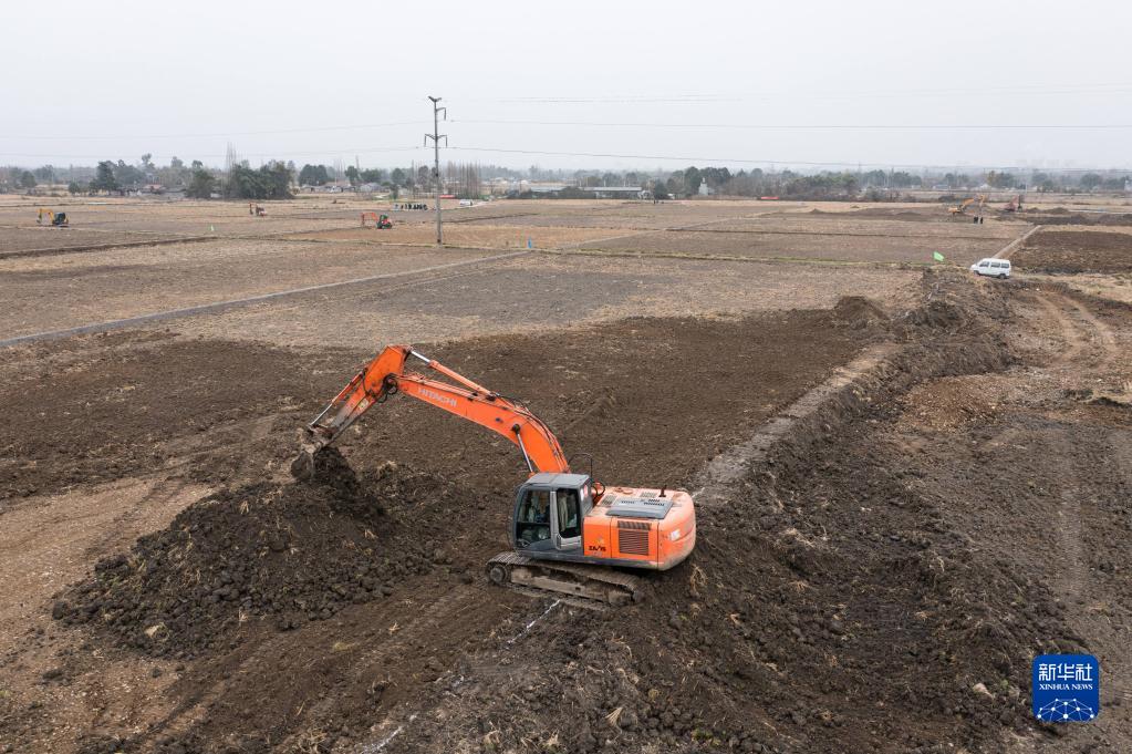 1月14日,在綿竹市孝德鎮(zhèn)清道社區(qū),挖掘機(jī)在整治農(nóng)田(無(wú)人機(jī)照片)。