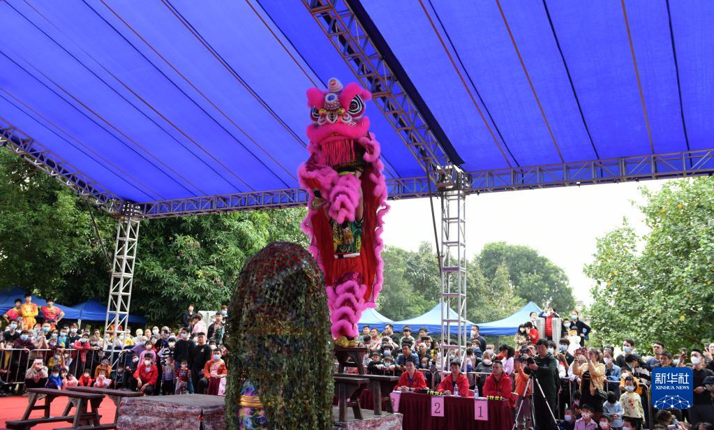 當日,由廣州市黃埔區九佛街道主辦的獅王爭霸賽活動在蓮塘古村舉行,參賽獅隊輪番登場,展示“絕活”,營造出歡樂祥和、熱鬧喜慶的節日氛圍。