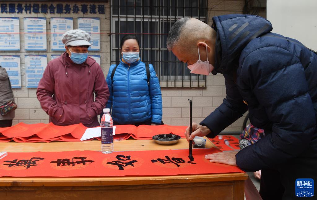 1月16日,在廣西南寧市西鄉塘區新陽街道永和村,書法愛好者在為群眾寫春聯。