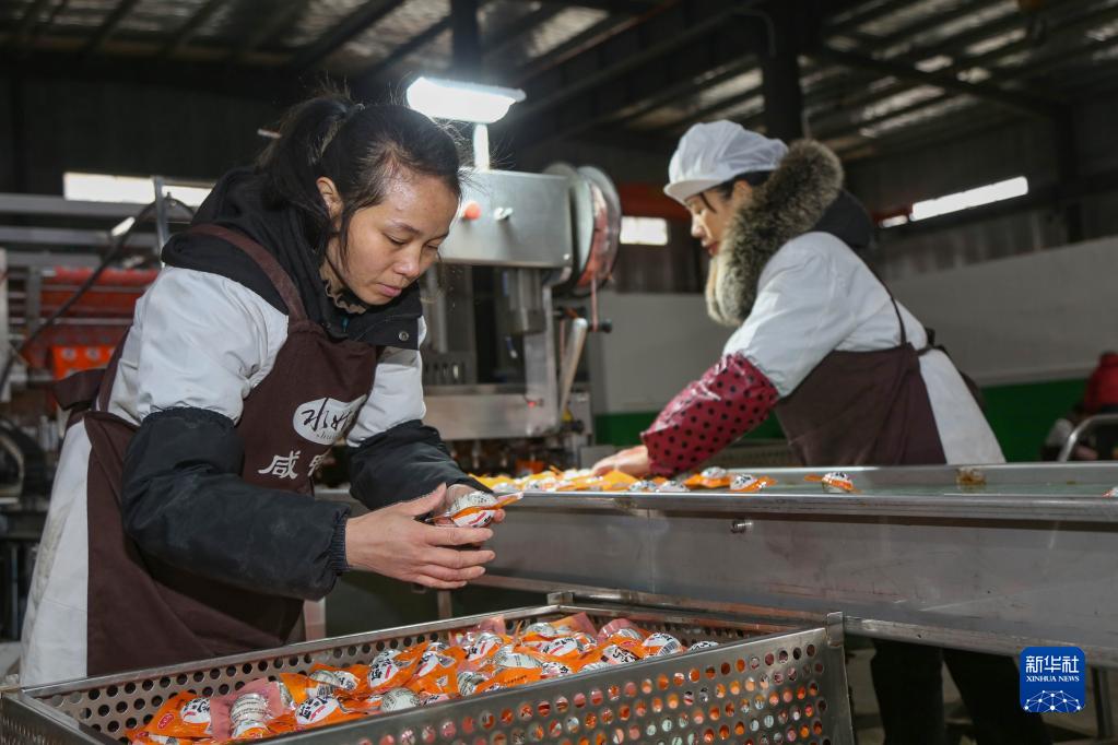 1月16日,工人在貴州省黔東南苗族侗族自治州三穗縣一家食品加工廠檢查咸鴨蛋包裝質量。