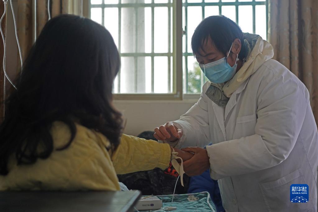 在江西省豐城市鐵路鎮(zhèn)楊坊村衛(wèi)生所,村醫(yī)徐秋生女兒徐柳珍給患者打吊針(1月11日攝)。