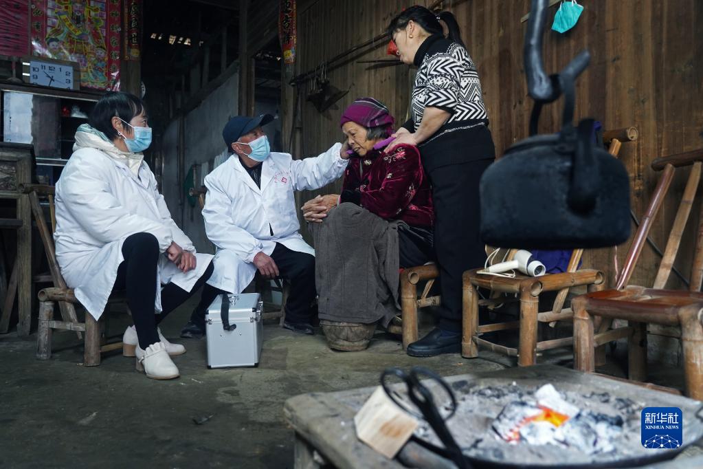 在江西省豐城市鐵路鎮(zhèn)楊坊村,村醫(yī)徐秋生(左二)與女兒(左一)上門為徐全香老人看病(1月11日攝)。