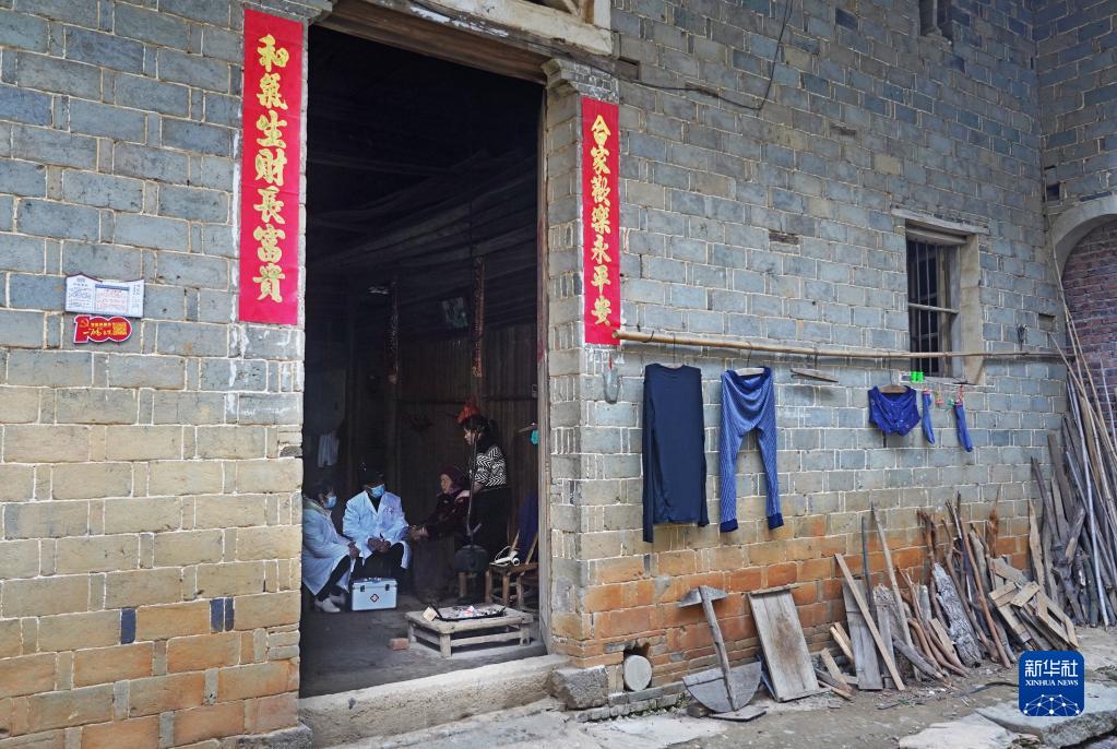 在江西省豐城市鐵路鎮楊坊村,村醫徐秋生(左二)與女兒(左一)上門為徐全香老人看病(1月11日攝)。
