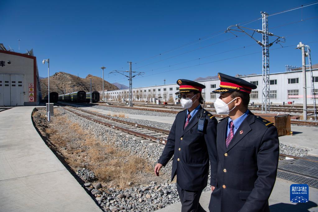 在拉薩機輛整備中心,黃起崗(右)和同事前往動車組檢修庫(1月11日攝)。